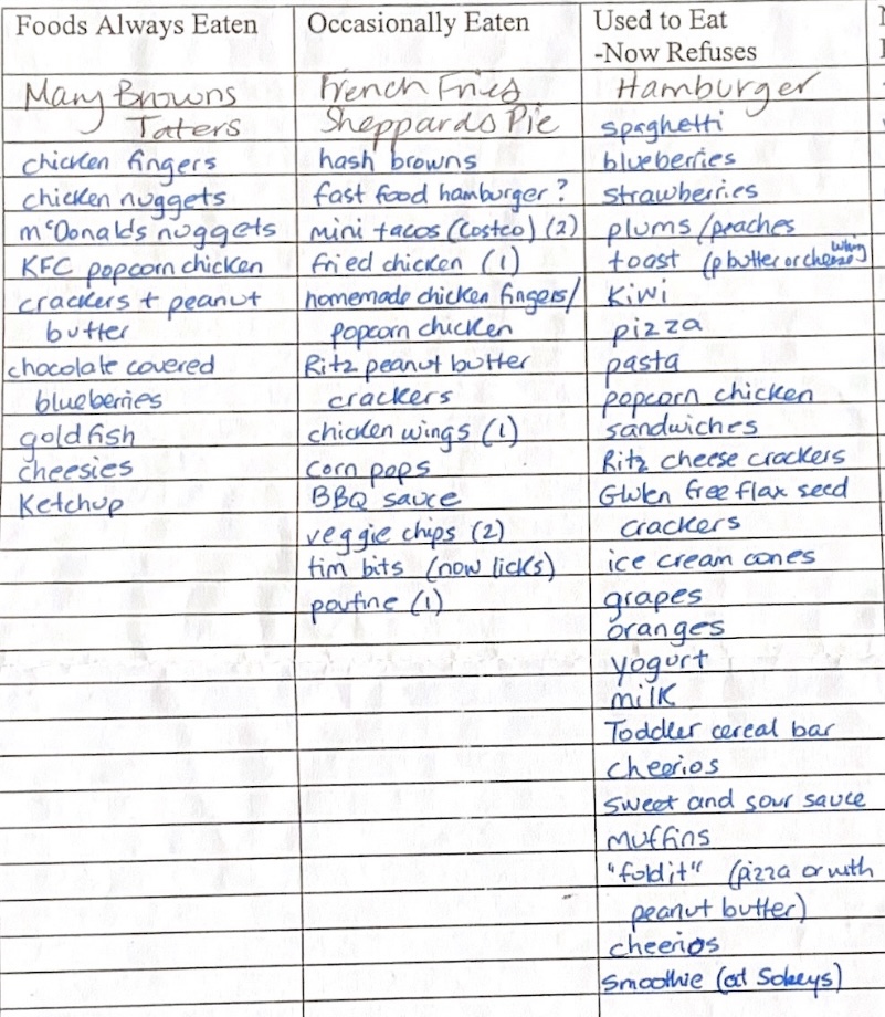 Recently I was cleaning up my many ‘Tyson’ binders (other parents of autistic children will know what I am talking about) and I found a sheet of paper with a list of all the foods Tyson eats, occasionally eats and now refuses to eat.