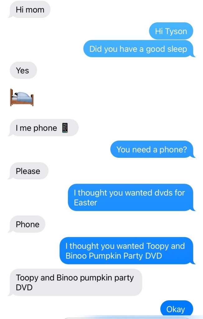 Tyson is considered nonverbal and can verbally only say a few words. He does have some sounds which sound the same to us but may have different meanings to him.
