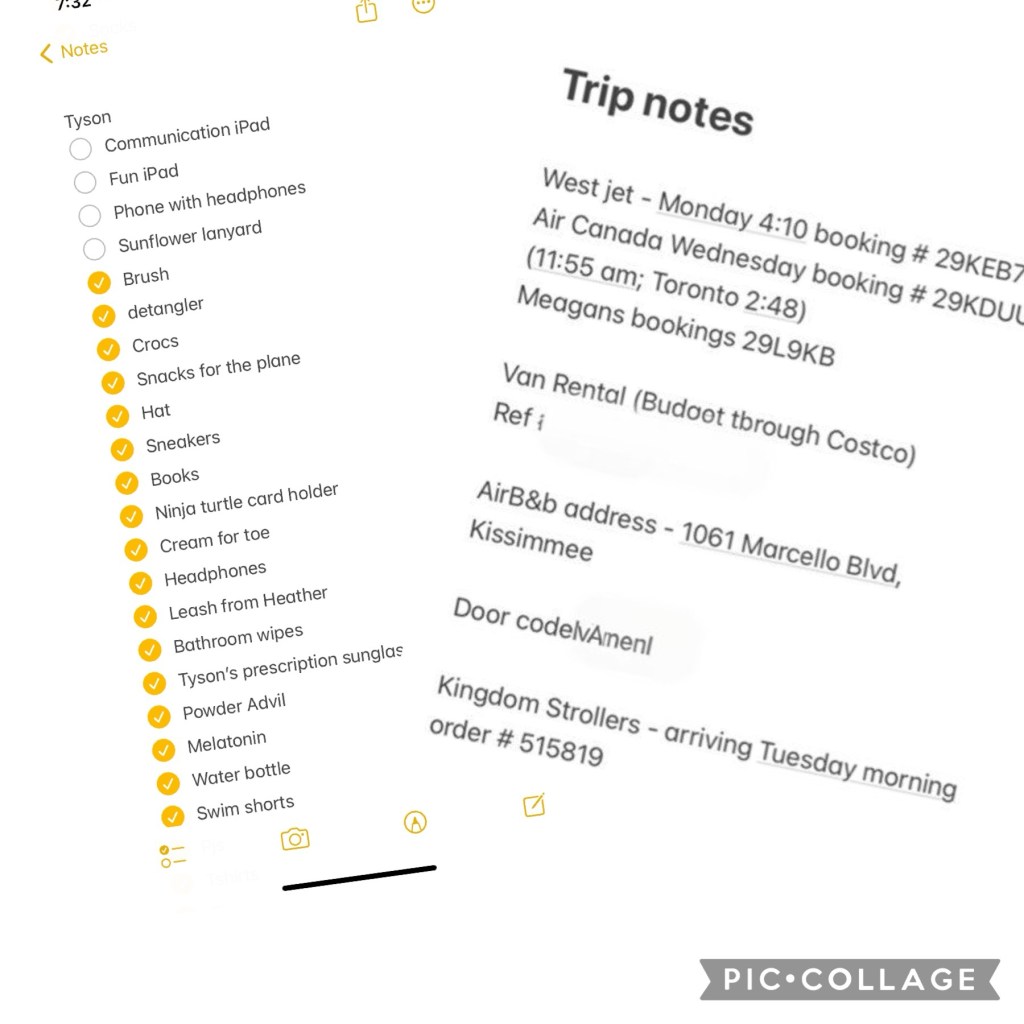 And I like to make multiple lists – things I need to do before we go (like apply for passports, DAS and IBCCES), things to pack for the flight (headphones, snacks, communication iPad, fun iPad X2, chargers, extra change of clothes), things to pack for when we get there, things I want to buy when I am there and not quite a list but a “Trip Note” that includes details related to our trip (booking numbers for flight, van rental, places of interest and any tips that I might forget).
